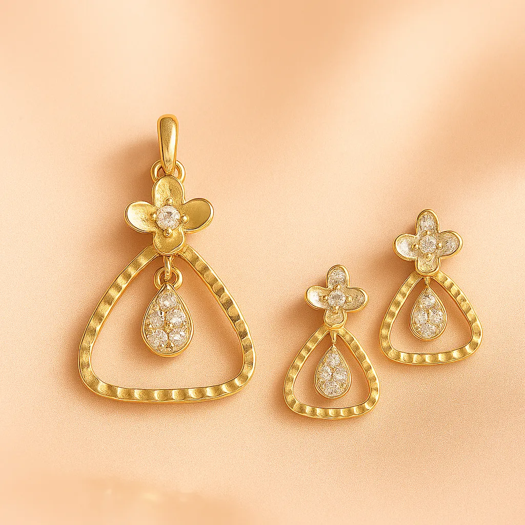+ Free ShippingBeautiful silver triangle drop floral pendant earrings set adorned with American diamonds, blending geometric charm with floral elegance, suitable for parties, weddings, and cultural celebrations.