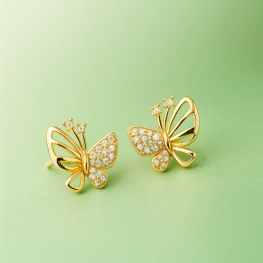 Delicate butterfly design silver alloy and American diamond stud earrings with intricate golden finish, crafted to symbolize elegance and transformation. The wings are encrusted with sparkling stones, creating a radiant shimmer that highlights your style whether paired with festive attire or daily wear, ensuring timeless charm and versatile beauty.