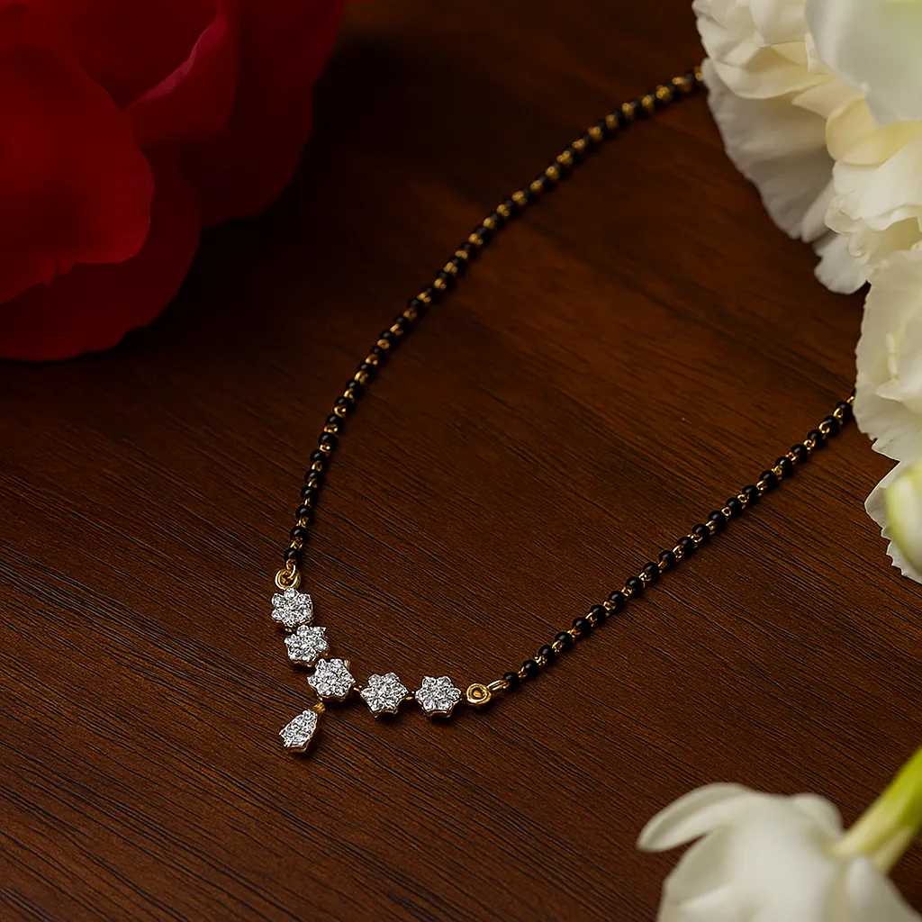 Why You’ll Love It: This mangalsutra captures the essence of femininity and tradition with its intricate floral details. The American diamond sparkle adds glamour, while the premium polish ensures long-lasting brilliance. Its lightweight design allows you to wear it effortlessly from morning rituals to evening celebrations. Perfect for women who appreciate a balance of elegance and comfort, this piece resonates with both cultural values and modern aesthetics.