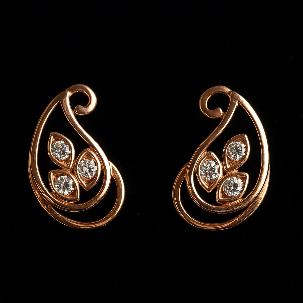Paisley stud earrings crafted with silver alloy, premium gold polish, and American diamonds, designed in a graceful pattern that symbolizes tradition with a modern twist. Their shimmering stones sparkle with every movement, while the polished finish adds a luxurious appeal. Perfect for women who love timeless accessories that pair beautifully with both ethnic and western attire.