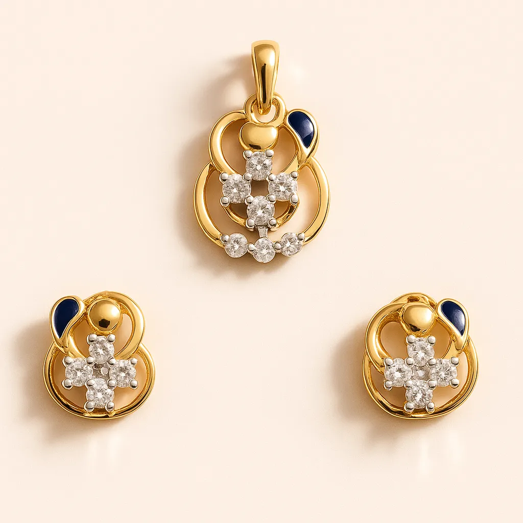 Eye-catching silver blue accent floral pendant earrings set adorned with American diamonds. The blue accent brings vibrant color to the floral motif.
