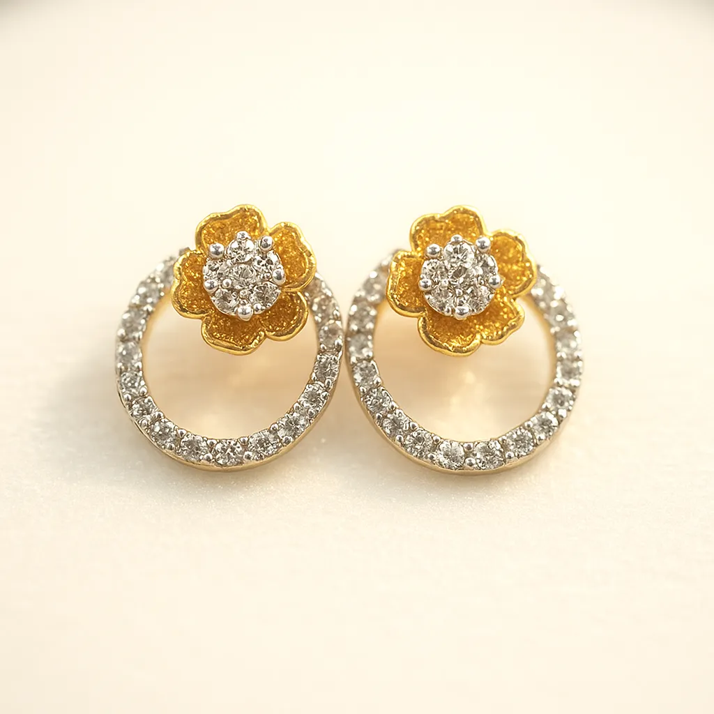 Flower hoop stud earrings made with silver alloy and premium gold polish, adorned with shimmering American diamonds. The golden floral top with a diamond-encrusted hoop exudes delicate charm, offering timeless elegance and radiant sparkle for festive occasions, weddings, or stylish everyday wear.