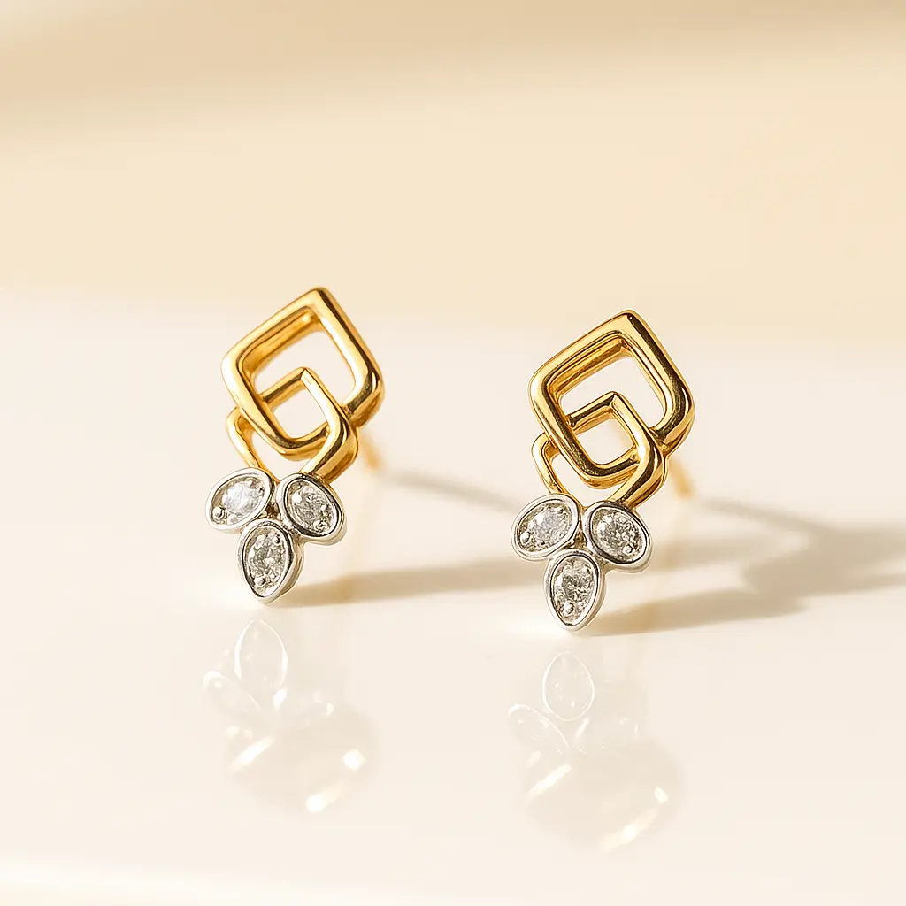 Geometric linked design silver stud earrings crafted from silver alloy premium gold polish and American diamonds bold abstract interlinked shapes versatile for office wear festive occasions or casual outings stylish lightweight and durable