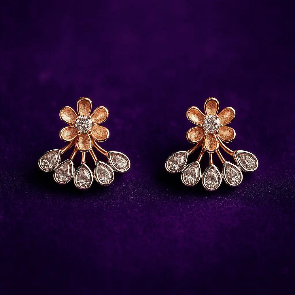 Why You’ll Love It: These earrings are a fusion of floral elegance and fan-inspired artistry, creating a piece that’s both unique and fashionable. The American diamonds add sparkle, while the polished gold finish ensures timeless beauty. They are versatile accessories for women who appreciate jewelry that draws compliments effortlessly.