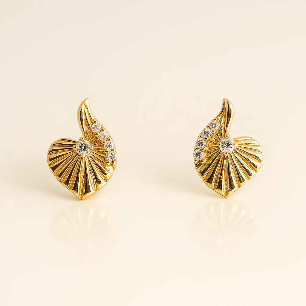 Graceful shell inspired silver stud earrings highlighted with dazzling cubic zirconia accents in radiant gold polish, designed to complement ethnic and modern outfits alike.|Details: – Metal: Silver Alloy with Premium Gold Polish – Closure: Push Back – SKU Code: ER033