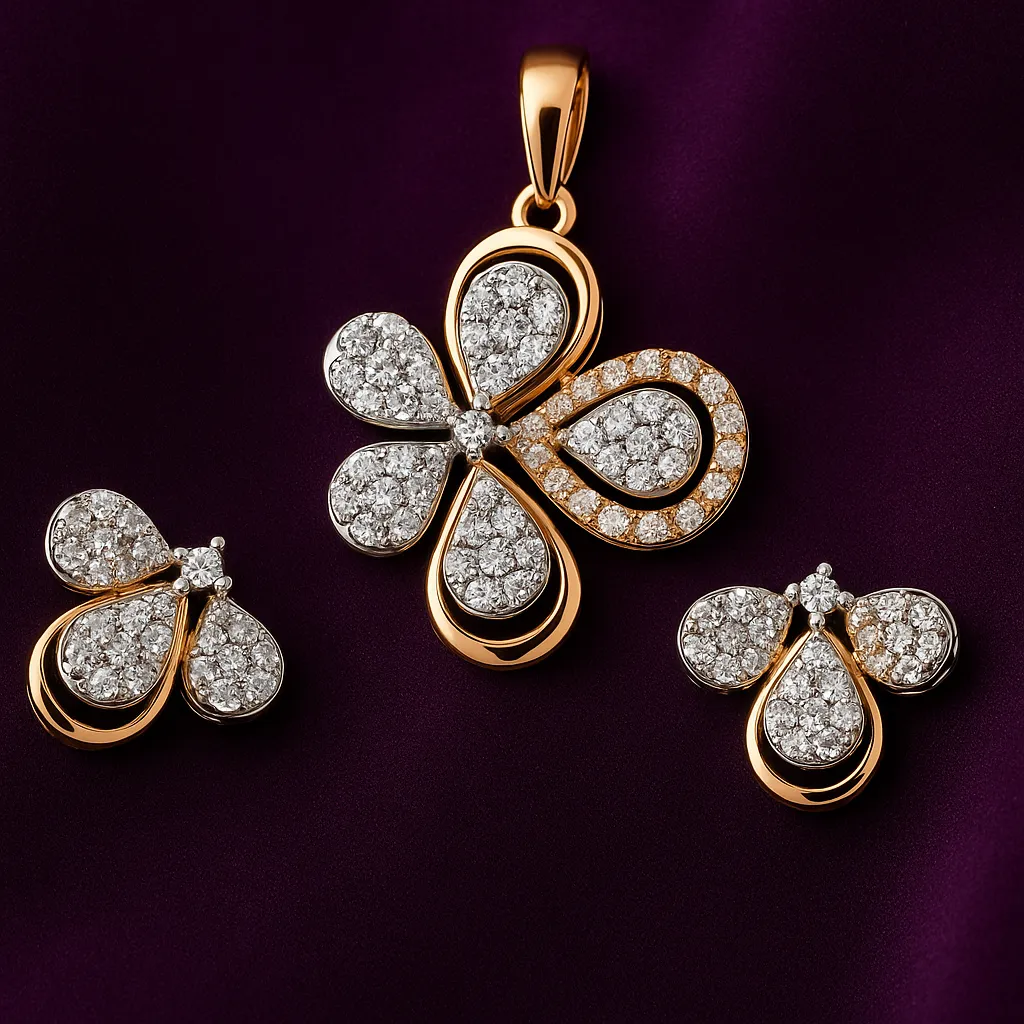 Graceful Silver Teardrop Clover Pendant Earrings Set with American Diamond