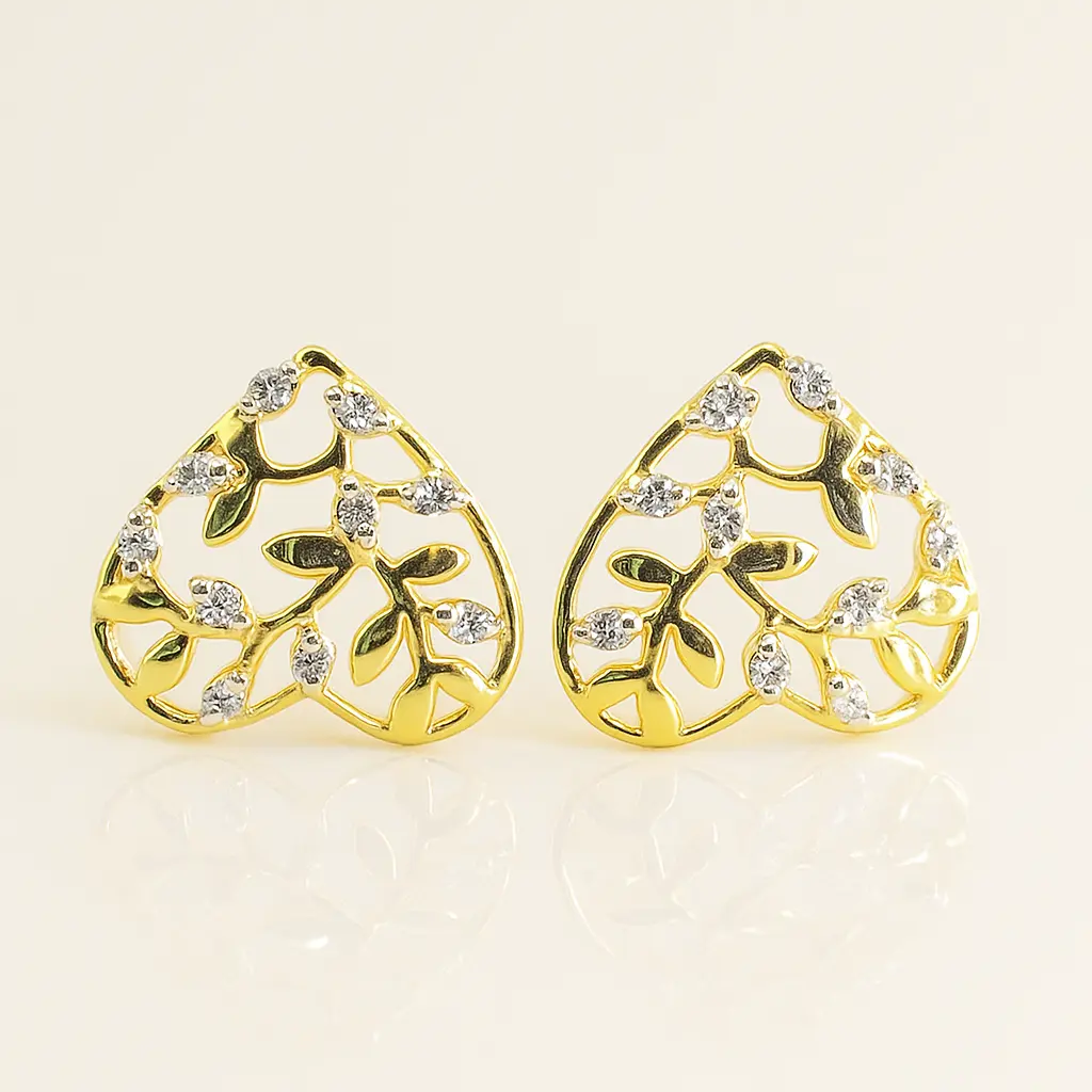 Heart shaped leaf pattern silver stud earrings crafted with silver alloy premium gold polish and American diamonds featuring symbolic design of love and nature lightweight durable and perfect for gifting festive occasions or everyday elegance