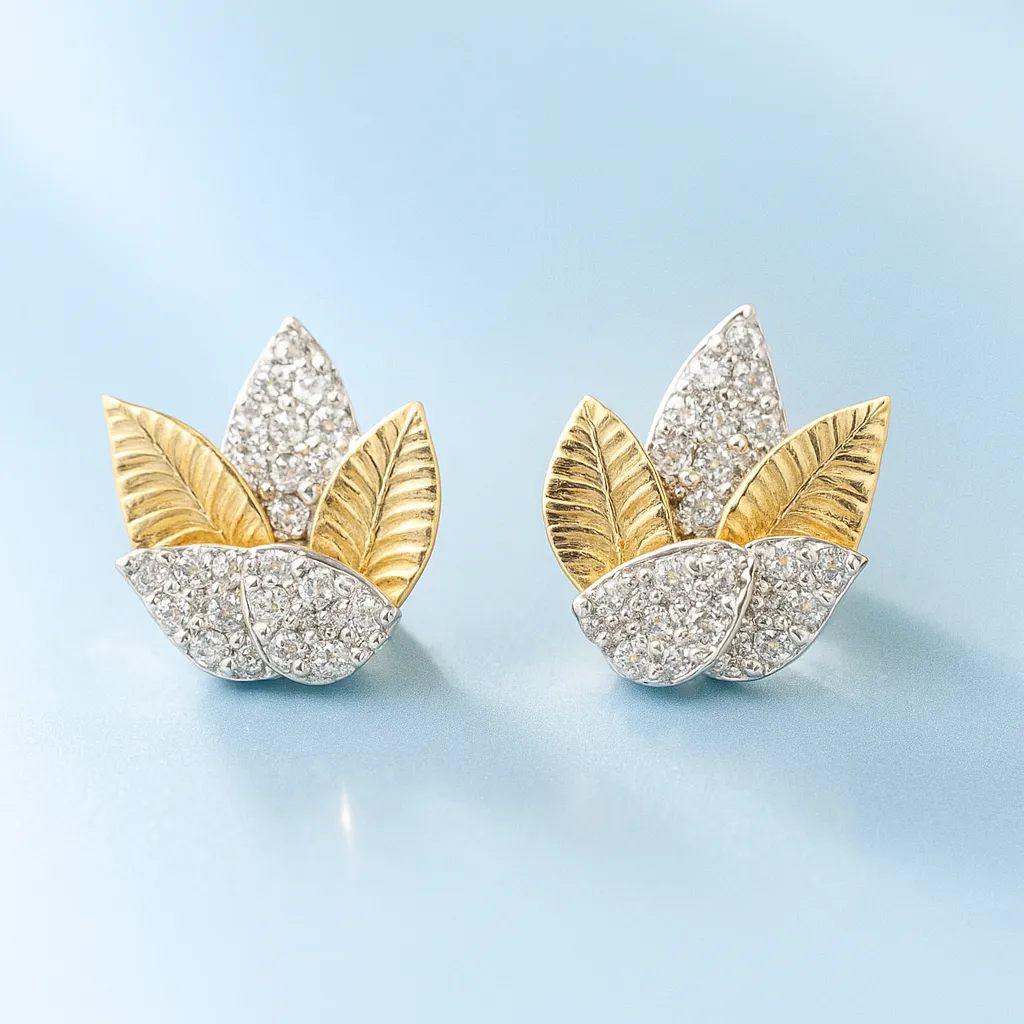 These leaf cluster stud earrings bring the beauty of nature into fine design. Each stud features multiple golden and diamond-studded leaves, crafted in silver alloy with premium gold polish. Their detailed finish and radiant sparkle make them perfect for special occasions while still being suitable for daily wear.