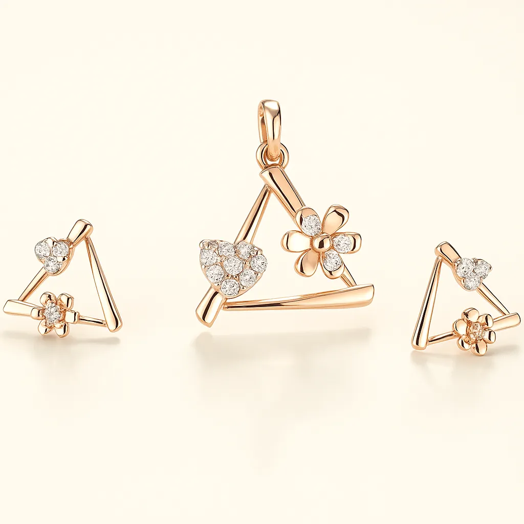 Modern silver triple floral pendant earrings set featuring American diamonds. The triple floral motif reflects blooming elegance, making it stylish and versatile.