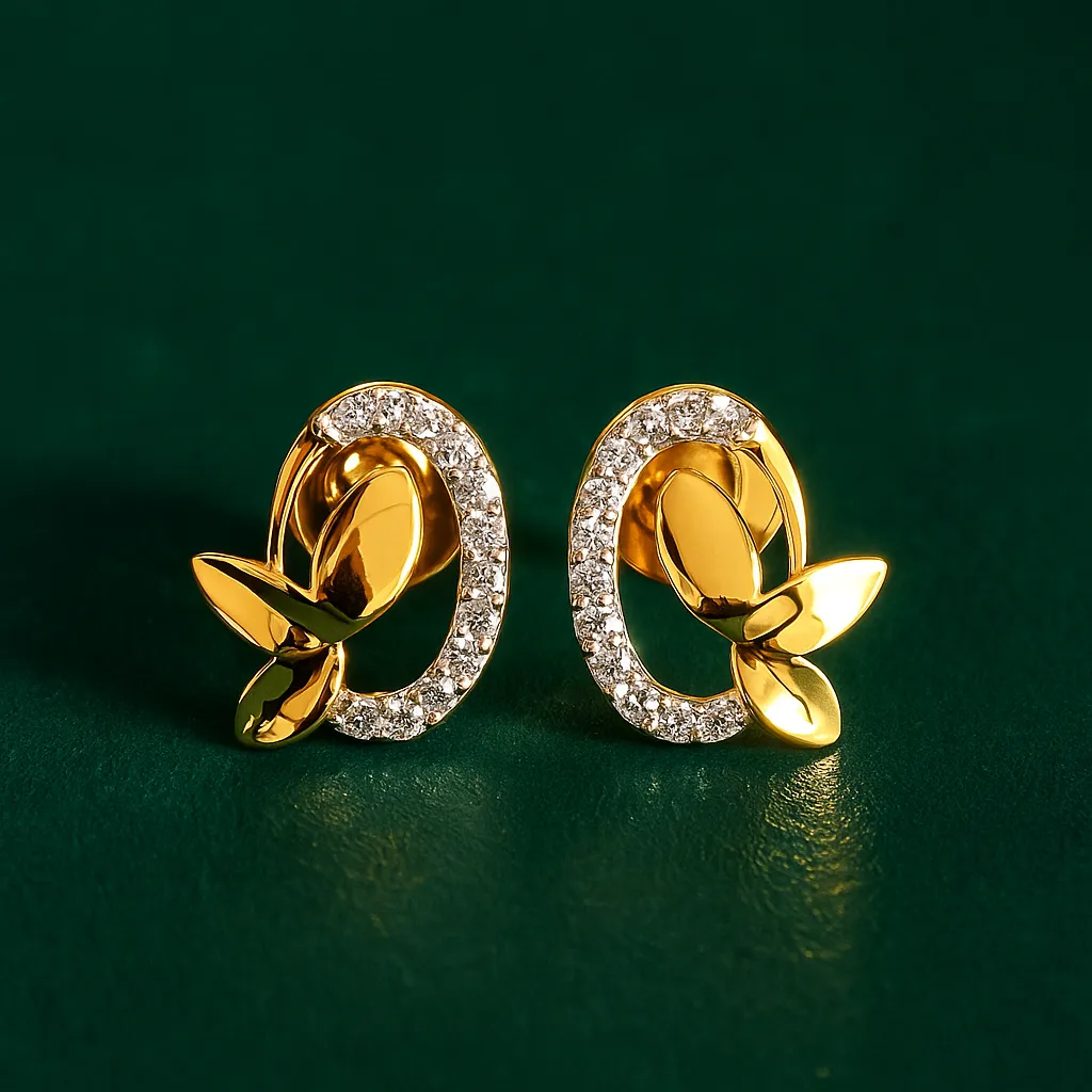Oval leaf stud earrings beautifully designed with silver alloy and premium gold polish, highlighted with glittering American diamonds. The intertwined oval and leaf motif gives them a natural and artistic charm, ideal for those who love modern elegance with a touch of botanical inspiration in their accessories.