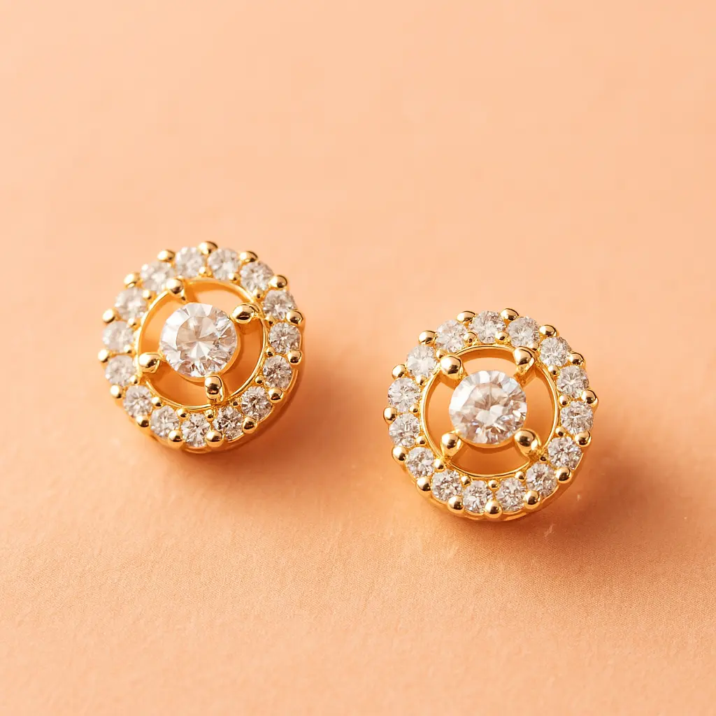 Why You’ll Love It: These earrings highlight the glamour of American diamonds with a radiant halo pattern that enhances their brilliance. The gold polish adds refinement, while the lightweight build ensures comfort. Perfect for women who love jewelry that shines bright, these studs remain timeless companions for grand occasions.
