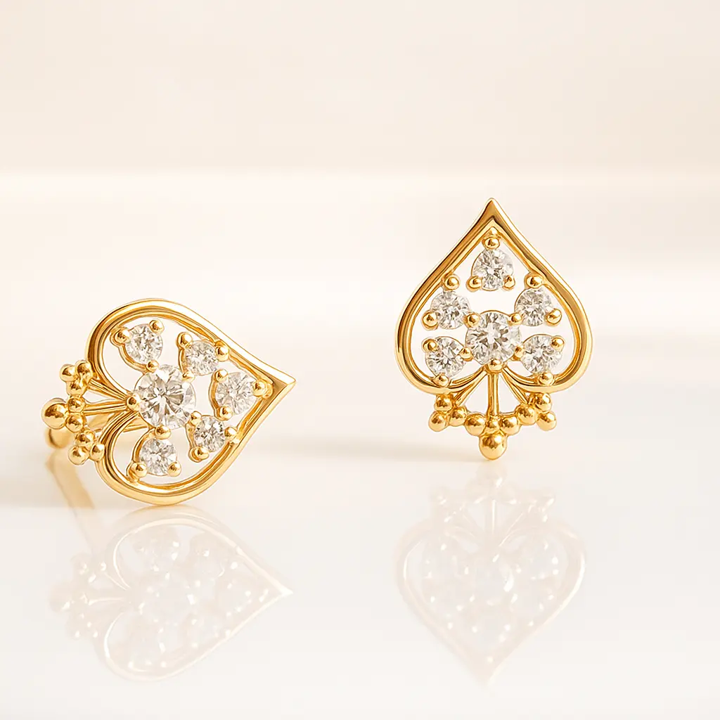 Royal spade motif silver stud earrings crafted with intricate detailing, shimmering cubic zirconia stones, and polished to perfection in gold finish. The spade shaped design combines regal sophistication with festive glamour, making them a bold choice for weddings, special occasions, or enhancing festive ethnic wear.